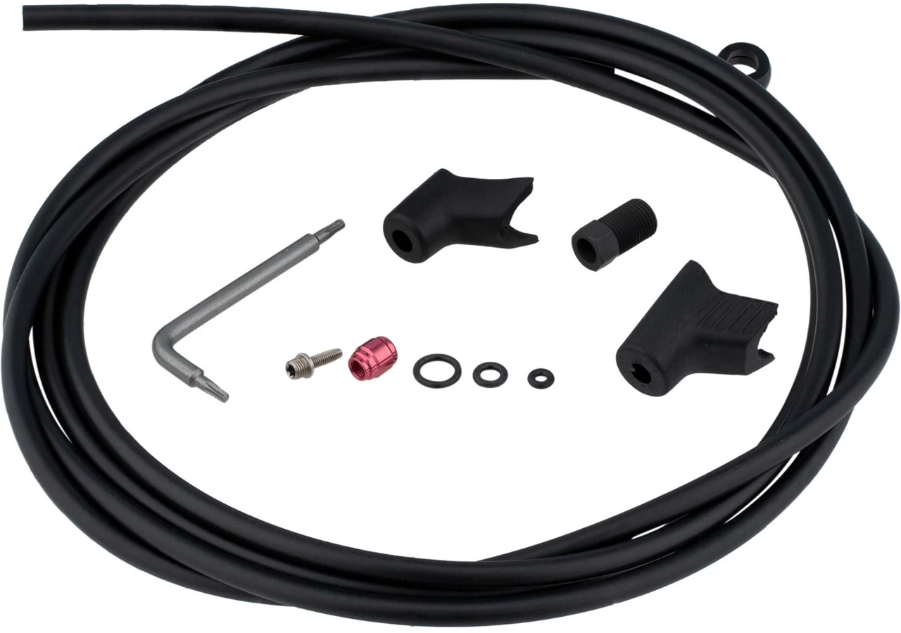 Lieferumfang:1 x Hydraulikleitung SRAM Monoblock 2000 mm1 x Olive1 x Insertpin1 x Überwurfmutter2 x Leitungsmanschette3 x O-Ring1 x Torx-Schlüssel